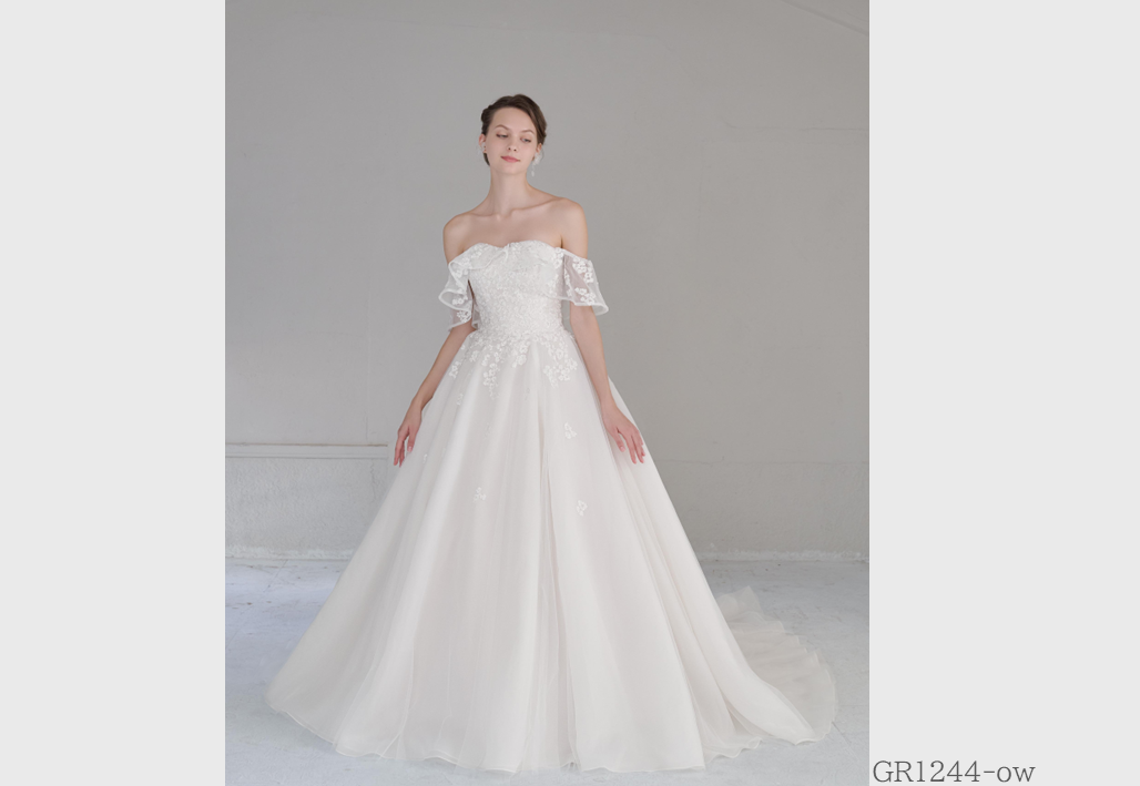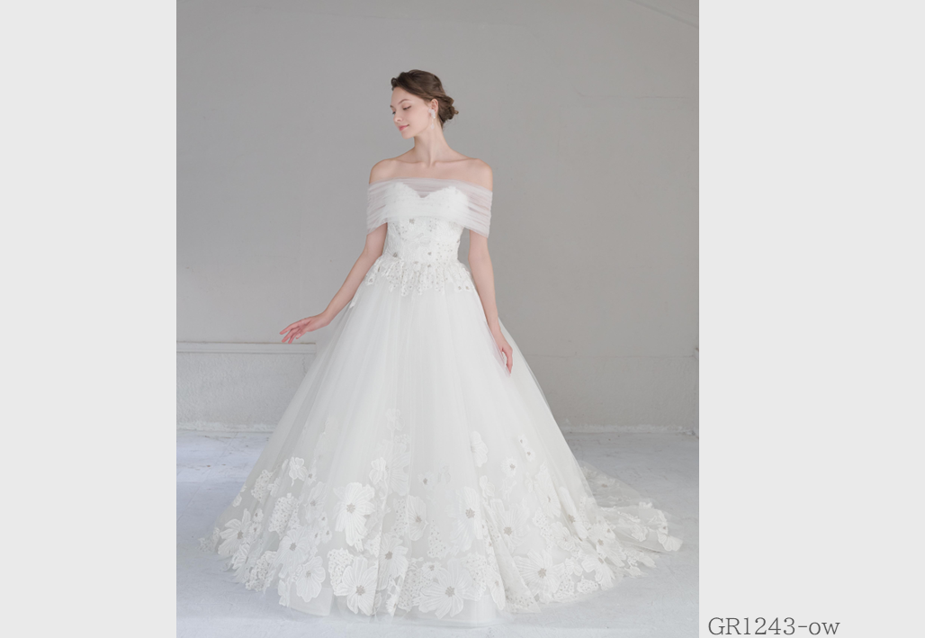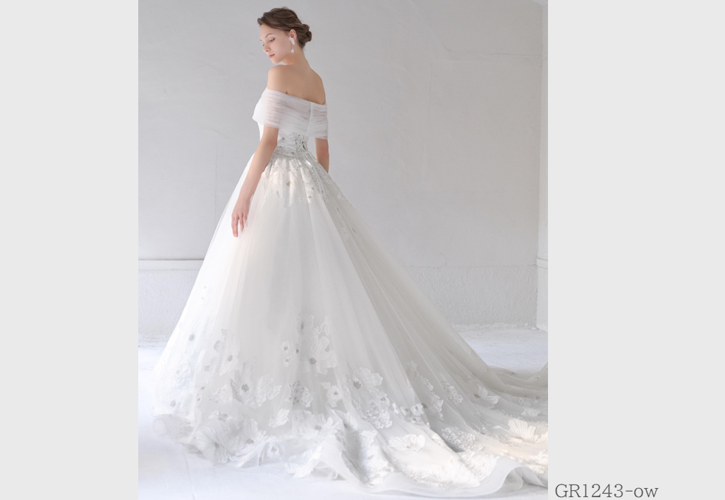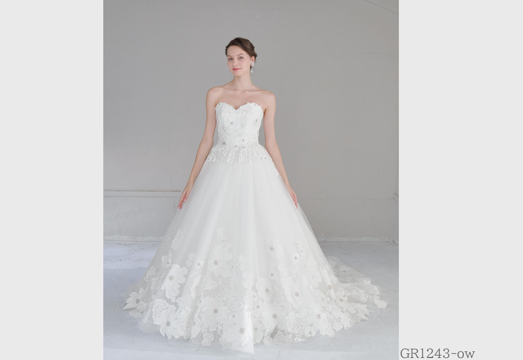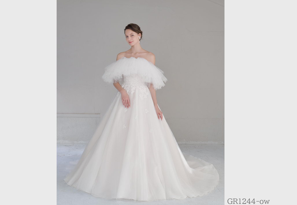 大胆にビーズ刺繍やレースを贅沢に使用し、トレンドを重視したインポート感溢れるウェディングドレス。グレースが持つ独自のテイストが実現されたオリジナルスタイル。
